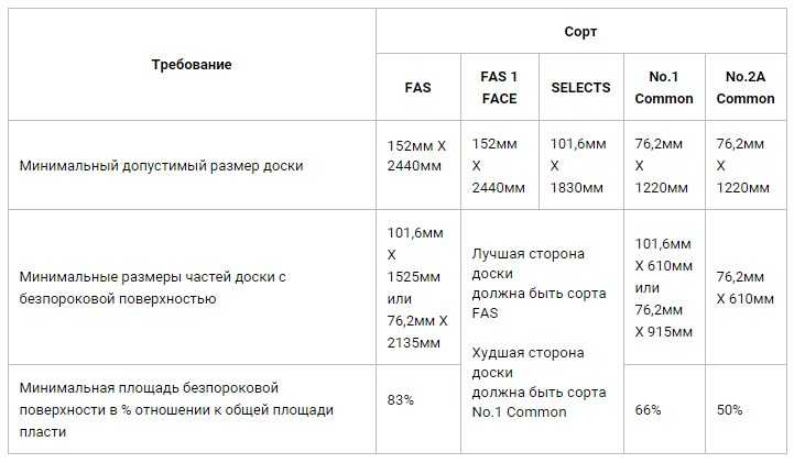 В таблице приведены названия сортов и предъявляемые при этом требования к пиломатериалу.