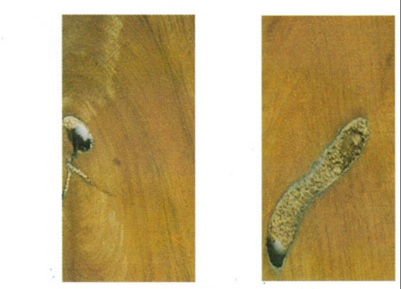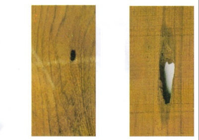 Отверстия в древесине, вызванные личинкой XYLEUTES CERAMICA.